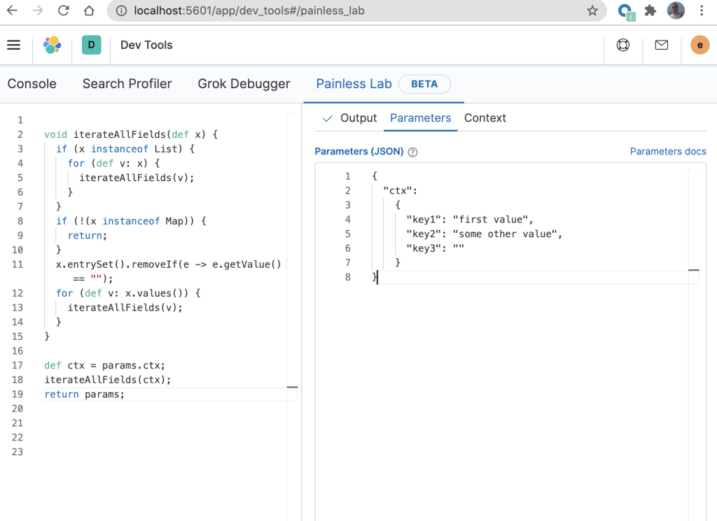 When developing this Painless script (before putting the code into an ingest pipeline), Painless Lab can be used to catch syntax errors in real time. The code from that blog can be tested in Painless Lab by entering test values in the “Parameters” tab as demonstrated in the right pane shown below.