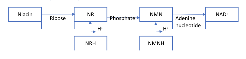 The potency of NRH and NMNH are much greater (~50 fold) than NR and NMN. NR and NMN are more potent than niacin and NAD+ but much less potent than NRH and NMNH. All of the precursor compounds are converted into NAD+ in the cell. Currently, NR and NMN are commercially available supplements.