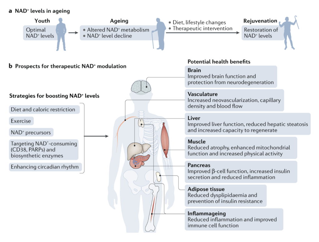 Ageing is associated with decreased nicotinamide adenine dinucleotide (NAD+) levels in tissues that promote or exacerbate ageing-related diseases. Thus, restoring NAD+ levels has emerged as a therapeutic approach to prevent and treat ageing-related diseases and to restore health and vigour during the ageing process. Some potential strategies that boost NAD+ levels include lifestyle changes, such as increasing exercise, reducing caloric intake, eating a healthy diet and following a consistent daily circadian rhythm pattern by conforming to healthy sleeping habits and mealtimes. Another approach is the use of small-molecule inhibitors or activators to boost NAD+ biosynthesis and the use of dietary supplements, including NAD+ precursors, such as nicotinamide mononucleotide (NMN) and nicotinamide riboside (NR). All of these approaches promote increased tissue NAD+ levels and are beneficial for health. These include improved tissue and organ function, protection from cognitive decline, improved metabolic health, reduced inflammation and increased physiological benefits, such as increased physical activity, which may collectively extend patient health span and potentially lifespan [Covarrubias et al., Nature Reviews, Molecular Cell Biology 22:119-141, 2021.]