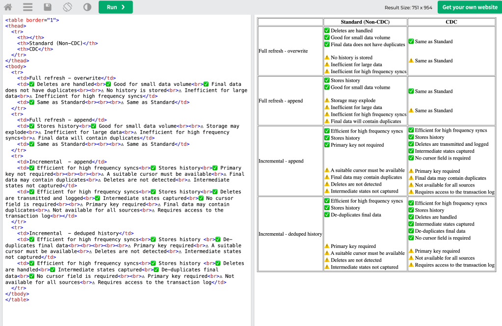 | Incremental - append | ✅ Efficient for high frequency syncs ✅ Stores history ✅ Primary key not required ⚠️ A suitable cursor must be available ⚠️ Final data may contain duplicates ⚠️ Deletes are not detected ⚠️ Intermediate states not captured | ✅ Efficient for high frequency syncs ✅ Stores history ✅ Deletes are transmitted and logged ✅ Intermediate states captured ✅ No cursor field is required ⚠️ Primary key required ⚠️ Final data may contain duplicates ⚠️ Not available for all sources ⚠️ Requires access to the transaction log |