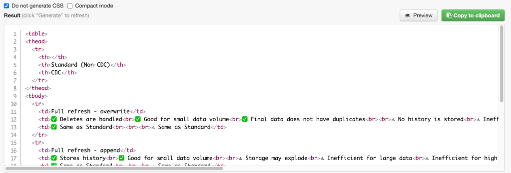 In this example, I have selected the checkbox that says “Do not generate CSS” (but if you want to include the styles, you can!). You can click on the green button to copy the generated HTML to the clipboard as shown below.
