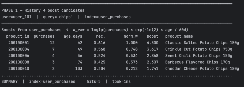 - PHASE 1 – the image below shows an example purchase history (which prior purchases match this intent) for user_101, along with the computed boosts.