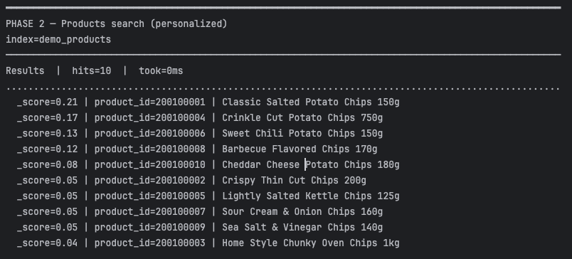 At its core, Elasticsearch matches user queries against text fields and ranks results using relevance scoring. But search doesn’t have to stop there. That’s where personalization comes in. By incorporating signals such as past purchases, browsing behavior, or recent activity, search results can be adjusted so the items most relevant to you appear higher. For example, if two people both search for “chips”, one might see classic potato chips at the top, while the other sees crispy thin-cut chips, depending on their history.