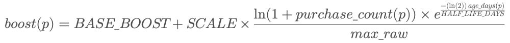 - Transparent: Boosts are calculated with a simple formula (log1p(purchases) × recency decay), easy to explain and tweak.